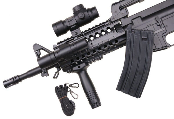 1. Designul M16: Replica este proiectată pentru a emula designul icnonic al puștii de asalt M16, inclusiv forma specifică a țevii, mânerul pistol ergonomic și mânerul de transport.