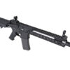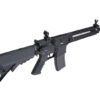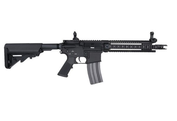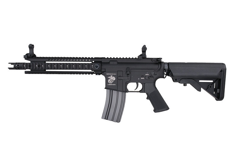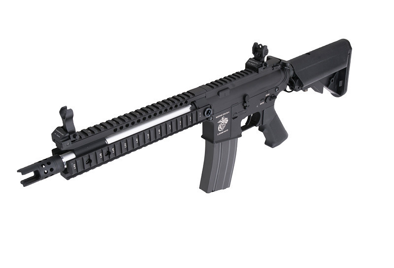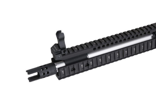 Replica de asalt SA-A01 de Specna Arms este realizată în mare parte din metal, întărit cu elemente de oțel în punctele cele mai vulnerabile ale replicii (elemente din oțel – toate șuruburile, știfturile și pivoturile tactice ale șurubului). Atât patul care păstrează bateria, cât și manerul , sunt realizate din polimer. Corpul replicii și dispozitivul de protecție RIS au trecut prin procesul de anodizare, ceea ce garantează un grad ridicat de protecție împotriva coroziunii. Vopseaua a fost aplicată printr-un proces de acoperire cu pulbere, după ce suprafața a fost supusă procesului de asamblare înainte de aplicarea vopselei. Aceasta oferă o rezistență mult mai mare decât de obicei a vopselei aplicate la abraziune. Corpul armei poartă marcaje USMC. Părțile replicii sunt foarte bine aliniate – într-un mod care ar putea fi remarcat până acum doar în replici de către astfel de producători de nivel superior precum G&P sau Classic Army, replica este, de asemenea, perfect echilibrată. Aceasta permite o manevrabilitate aproape ideală a replicii, iar greutatea acesteia este aproape neobservată odată ce replica a fost asigurată. Replica prezintă un nou sistem de eliberare rapidă cu arcuri, așa-numitul sistem SAEC ™. Datorită acestui sistem, este posibil să se adapteze rapid și rapid puterea replicii la condițiile preconizate pe terenul de joc, fără a fi necesară accesul la un atelier sau la un set de instrumente speciale. Procesul de schimbare a arcului este chiar mai rapid decât în cazul versiunii anterioare a sistemului. Datorită sistemului SAEC ™, nu este nevoie să scoateți gearboxul din replică – tot ce este necesar este să scoateți patul (nu sunt necesare unelte – este atașat cu un inel strâns și un zăvor), după care este necesar să slăbiți știftul situat sub pat împreună cu o lamă de arc montată pe un rulment. Schimbăm arcul principal, înșurubăm știftul înapoi în corp, atașăm patul și … ne întoarcem în joc! Întreaga operație durează doar un moment și, să o spunem din nou, nu necesită utilizarea niciunui instrument.