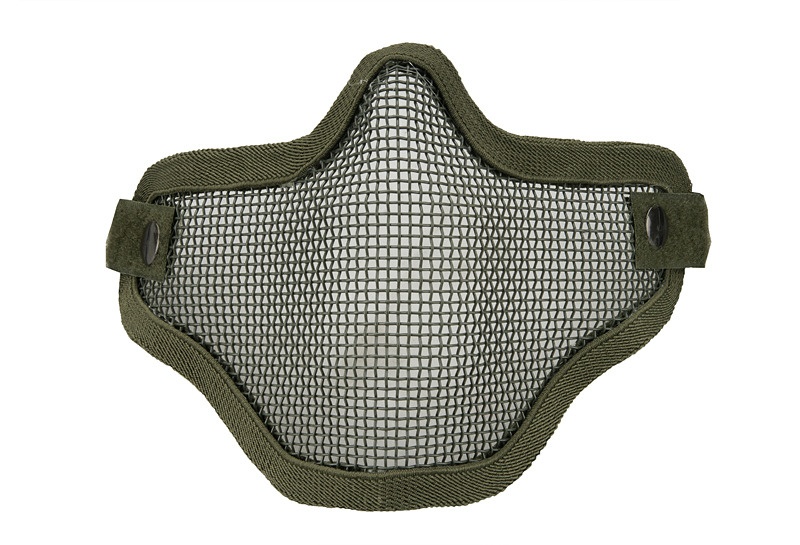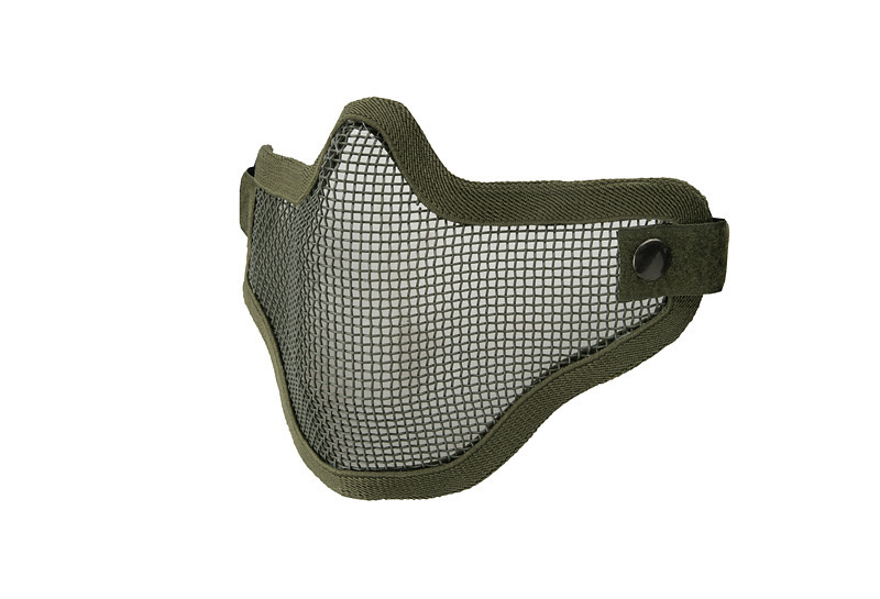 Masca tip botnita, de culoare olive, confectionata din plasa de otel si acoperita cu material textil fin , pe partile laterale