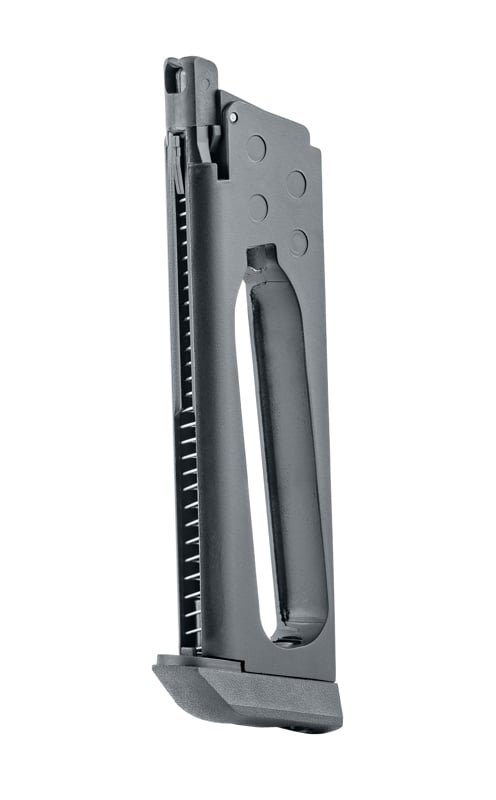 Magazia /incarcatorul este realizat in intregime din metal si are o capacitate de 15 de bile .