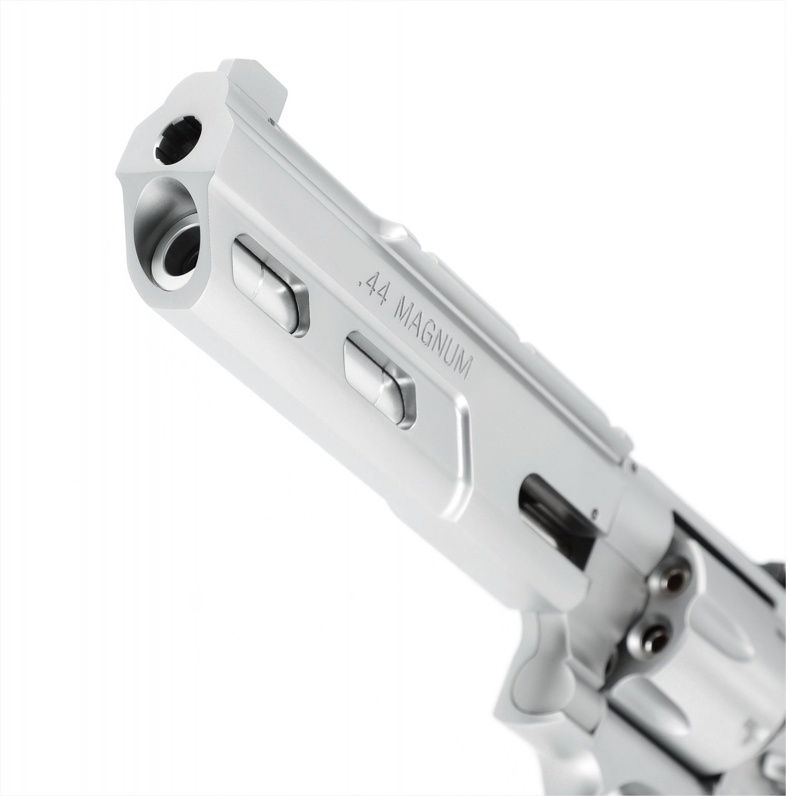 Construit integral din metal, revolverul are o greutate realista de 1.550 g, oferind o senzatie autentica in mana. Greutatile din partea frontala, detasabile, simuleaza sistemul original care muta centrul de greutate pentru un control mai bun la tragere. Manerul cauciucat, antialunecare, asigura o priza excelenta chiar si in conditii dificile.